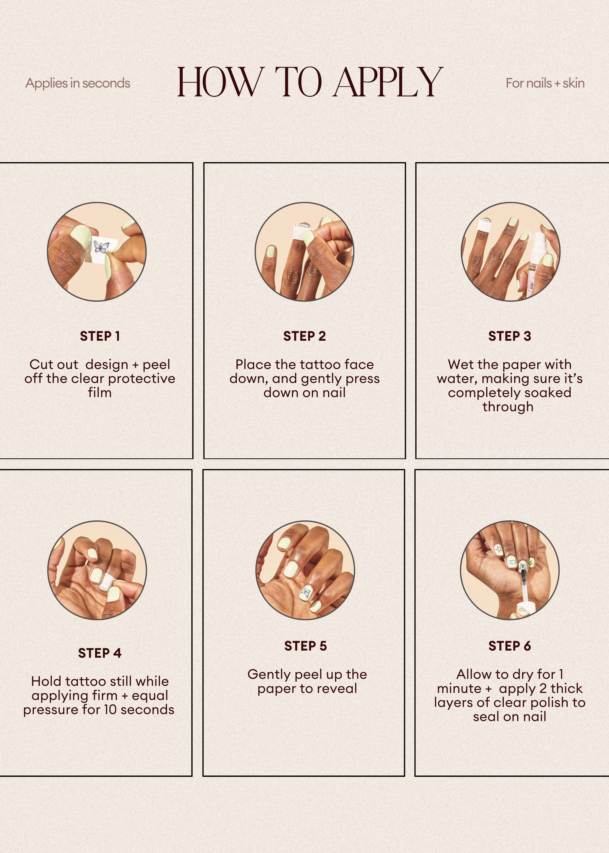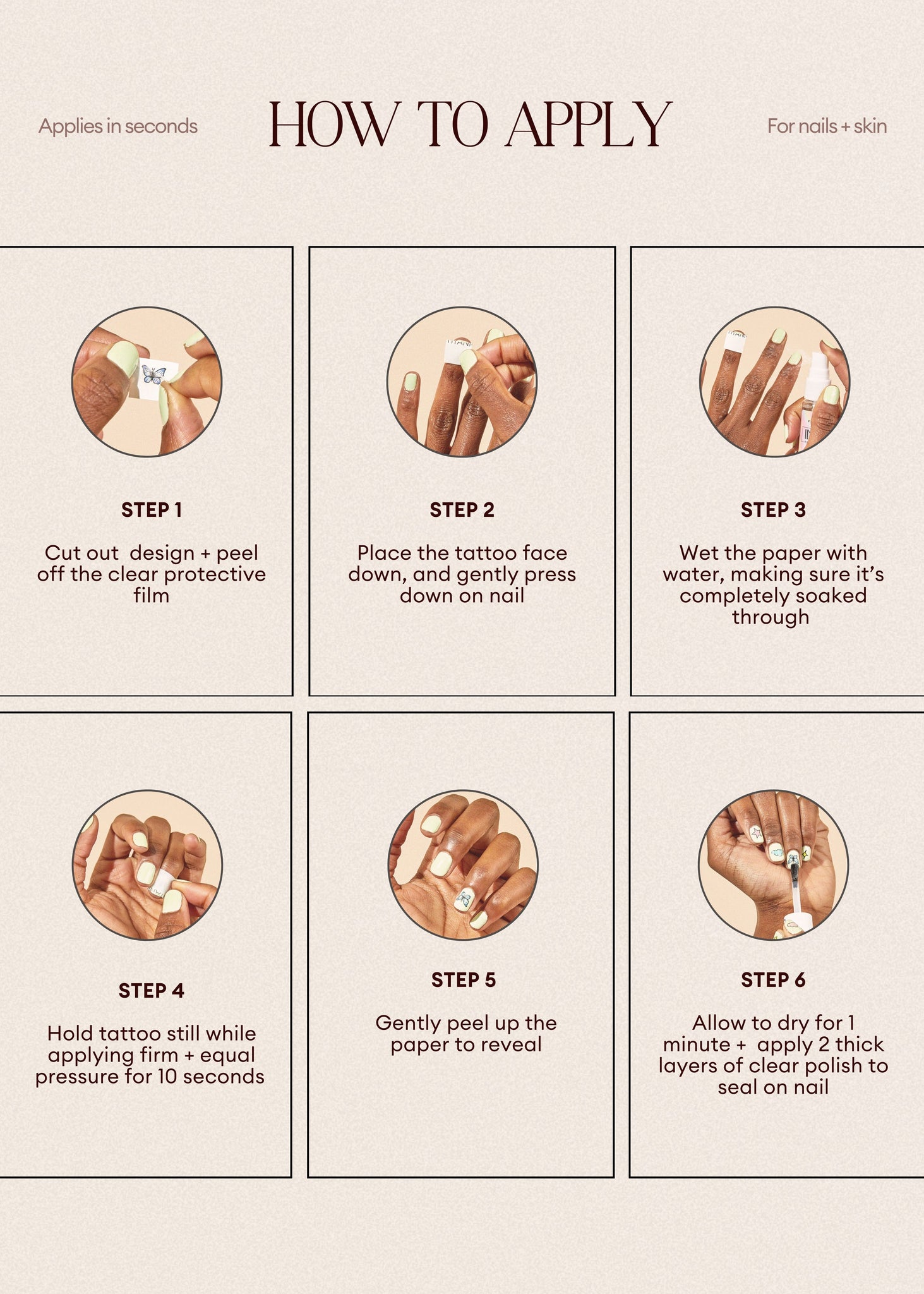 For nail art tattoos: after applying, let tattoo dry for about 1 minute and apply two thick layers of clear top coat to seal on your nail. Pro tip: Apply another layer of top coat every few days to extend the life of your nail tat!