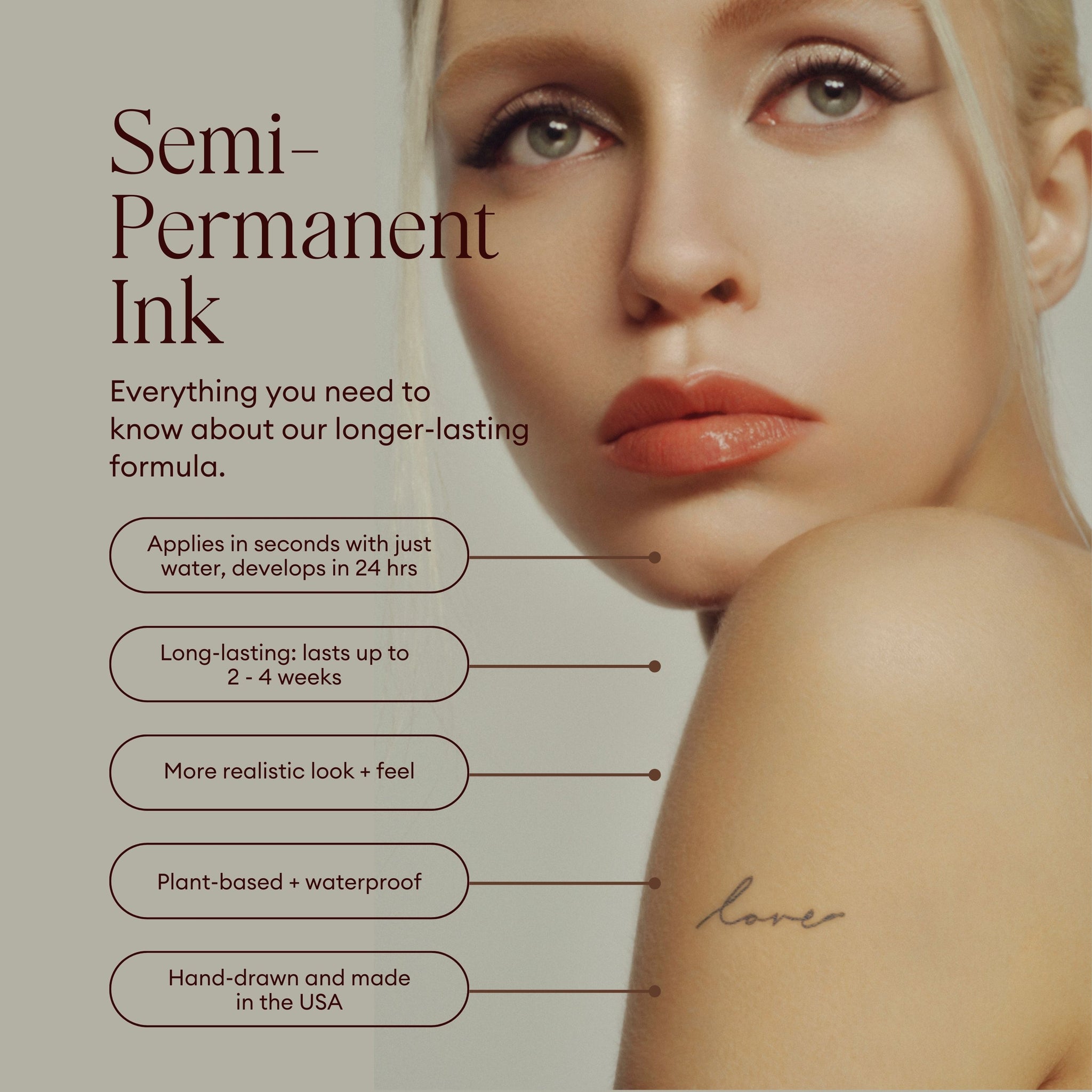 INTRODUCING SEMI-PERMANENT LONGER LASTING TATTOOS: With up to a 2 - 4 week lasting time, and an even more realistic look and feel, we’re so excited to bring you the biggest innovation in the semi-permanent tattoo space.
