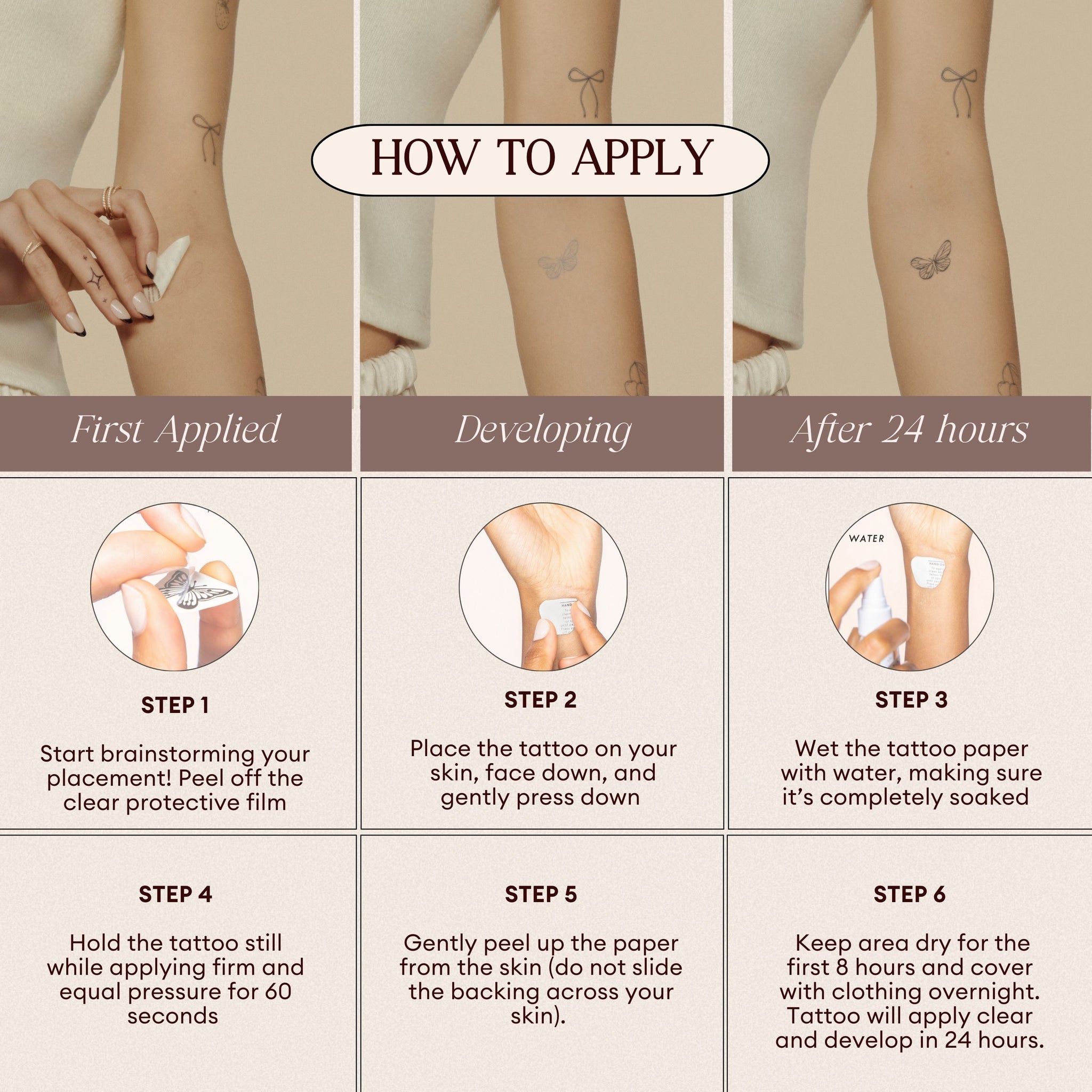 For nail art tattoos: after applying, let tattoo dry for about 1 minute and apply two thick layers of clear top coat to seal on your nail. Pro tip: Apply another layer of top coat every few days to extend the life of your nail tat!