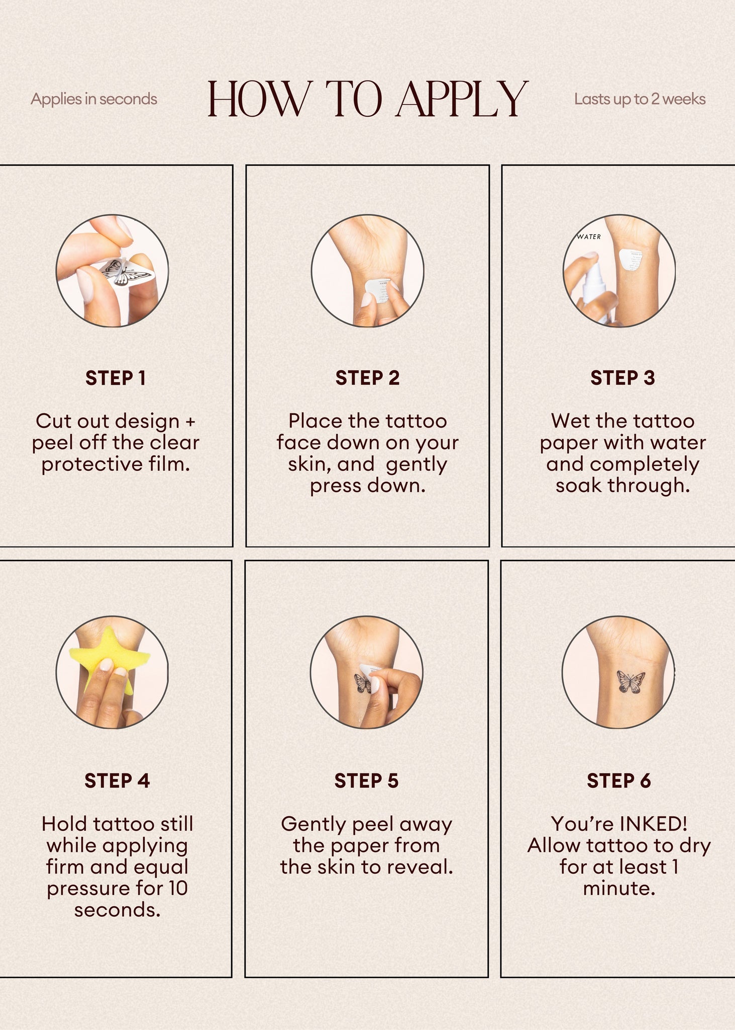 For nail art tattoos: after applying, let tattoo dry for about 1 minute and apply two thick layers of clear top coat to seal on your nail. Pro tip: Apply another layer of top coat every few days to extend the life of your nail tat!