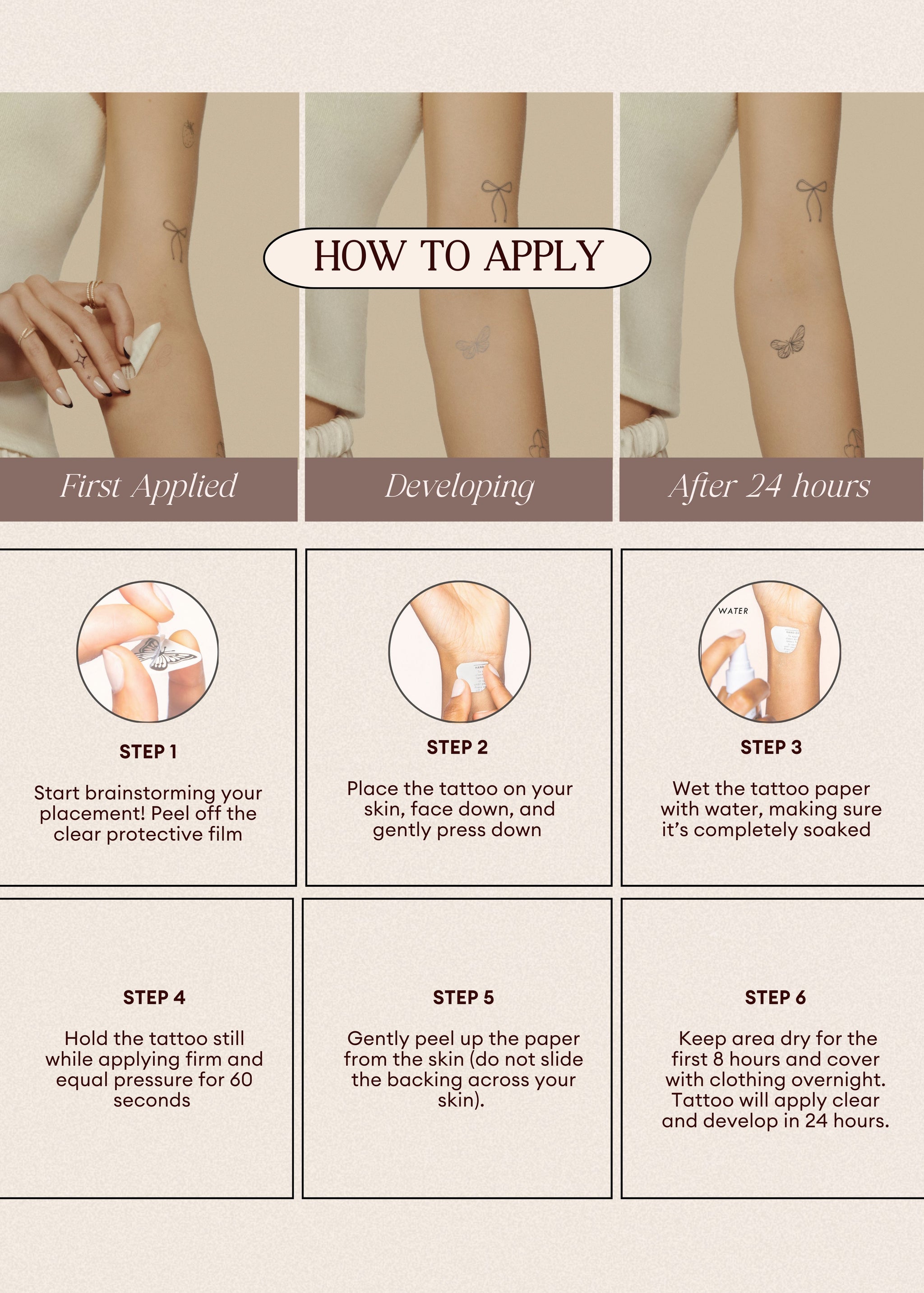 For nail art tattoos: after applying, let tattoo dry for about 1 minute and apply two thick layers of clear top coat to seal on your nail. Pro tip: Apply another layer of top coat every few days to extend the life of your nail tat!